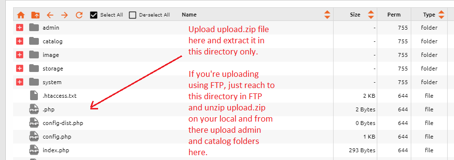 Upload admin and catalog folders to opencart installation directory using FTP or File Manager. There'll be already admin and catalog directories present. See Screenshot below: