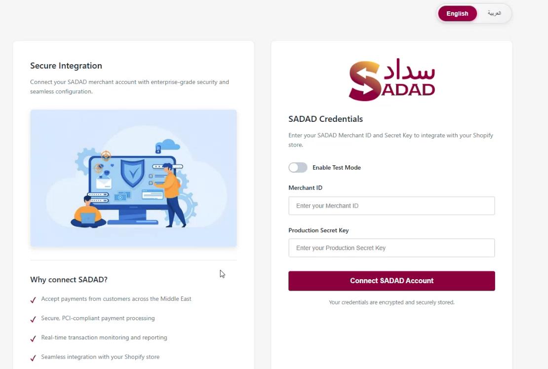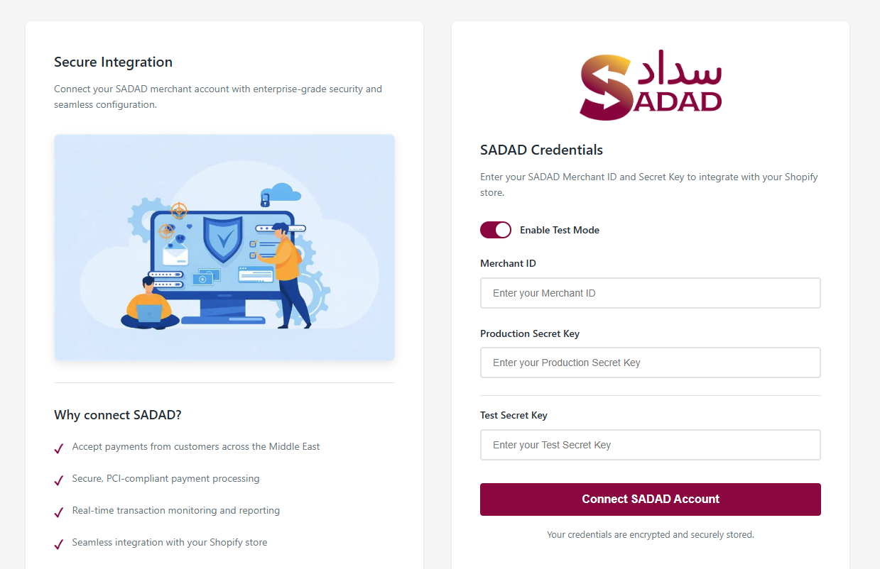 - Enter the Merchant ID and Secret Key provided by SADAD.